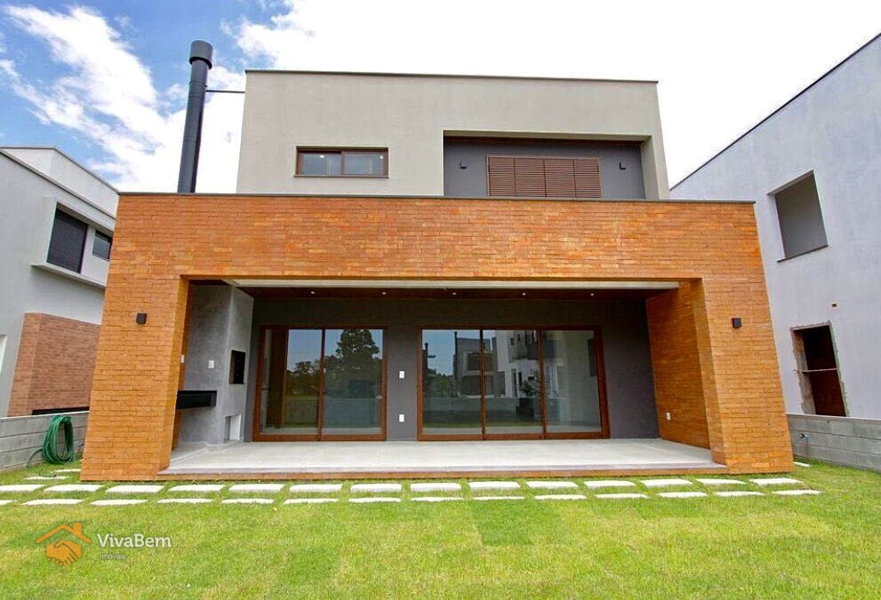 São 243m², quatro suítes, sendo uma térrea. Lareira e churrasqueira, espera de split em todos os ambientes, iluminação em LED, esquadrias alumínio amadeirado, bancadas, metais e louças de alto padrão, vaga para 2 carros. Piso porcelanato cimento queimado no térreo, segundo pavimento com assoalho de madeira. Condomínio Rosa Internacional.